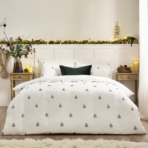 Winter Forest 100% Cotton Embroidered Duvet Cover Set White/Forest green