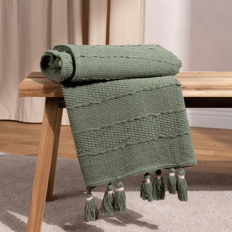 - Complete with a luxurious contrast yarn tassel trim, along the two short sides.