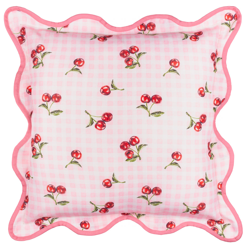 - Features a playful, hand-painted cherry design on a timeless check background.