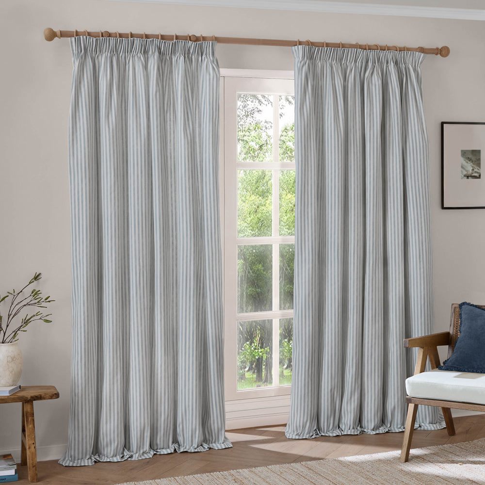 Hebden Striped 100% Cotton Lined Pencil Pleat Curtains Mineral Blue